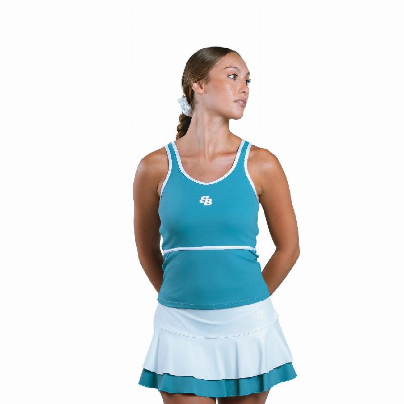 Il suo colore bianco, esaltato da un doppio volante in toni acquamarina, offre un movimento leggero e femminile che accompagna ogni movimento in campo.