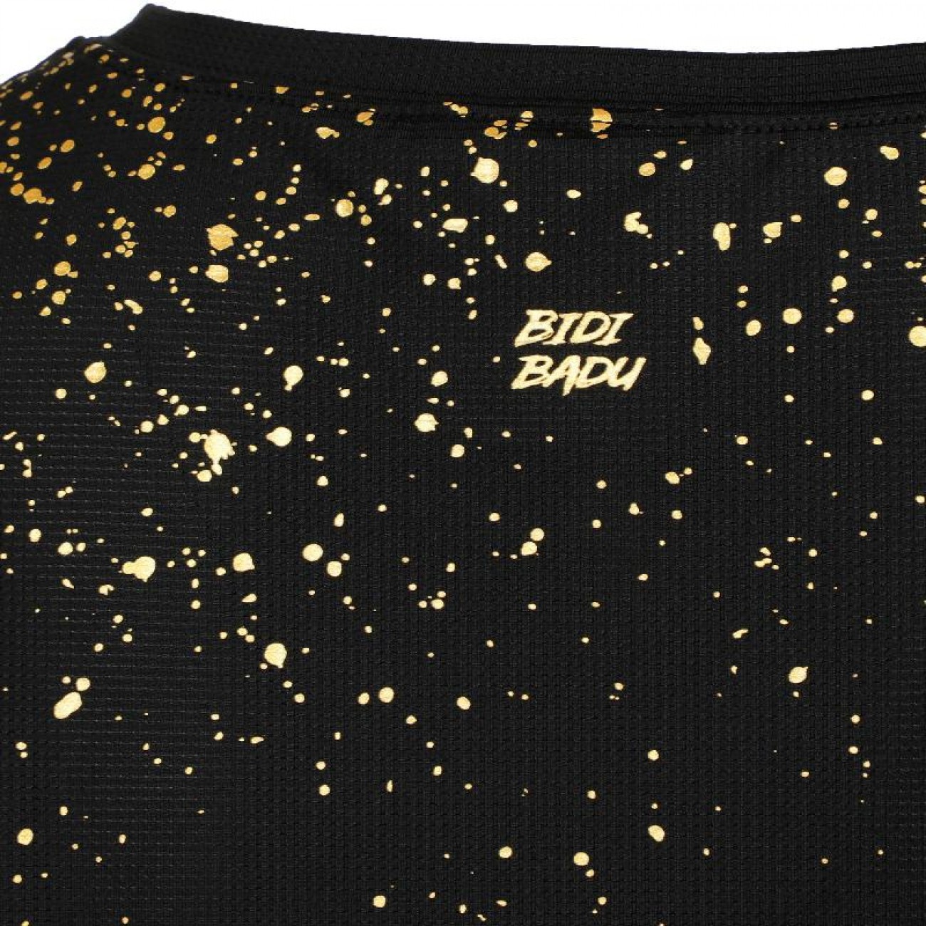 Su uno sfondo nero profondo, scintillano macchie dorate, ispirate al movimento aggraziato delle ceneri dei campi in terra battuta di Parigi.