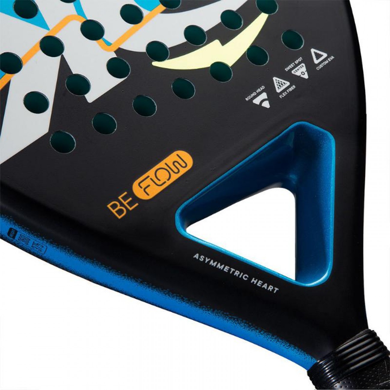 Il cuore asimmetrico della BE Flow ottimizza la distribuzione del peso sulla racchetta, migliorando cosi la manovrabilita e la stabilita ad ogni colpo.